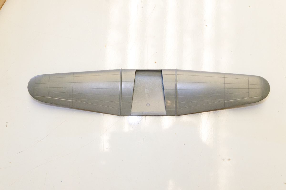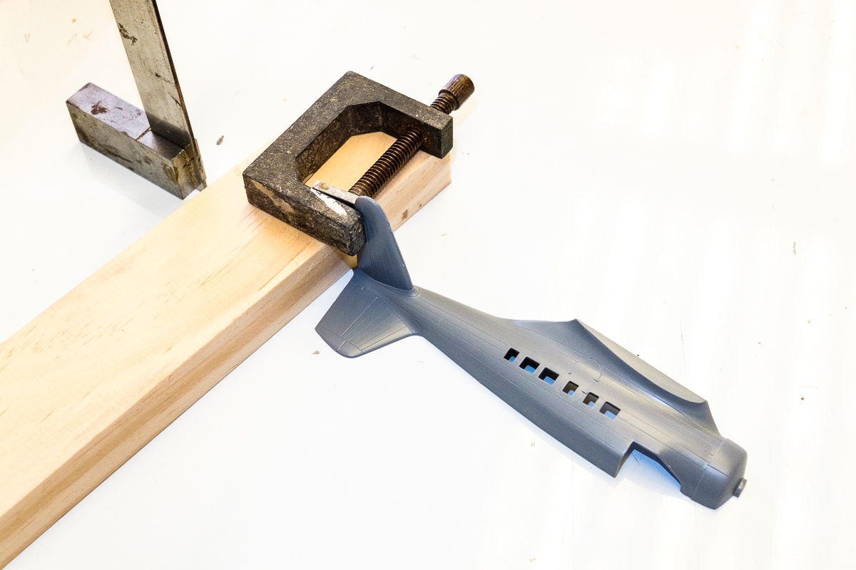 I’ve decided to experiment with a tip given to me by a friend – I’ve attached the horizontal stabilisers to the fuselage halves before glueing them together. I’ve jigged and braced the setting parts and used a set-square as reference. If they are wonky when the fuselage goes together I can always cut them off and re-do it by eye.