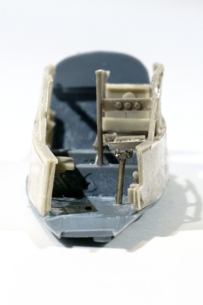 The material that they chose is a combination of an injection moulded base and polyurethane sides plus a myriad of resin details to be glued on. I can understand the resin seats working as they are small dumpy objects but the complex sides seem to have been an invitation to disaster. That’s want I got after a day of cutting , sanding, and fitting with cyanoacrylate glue. You see the designers expected that the two sides of the tub would bend around in unison and end up straight, but they didn’t.