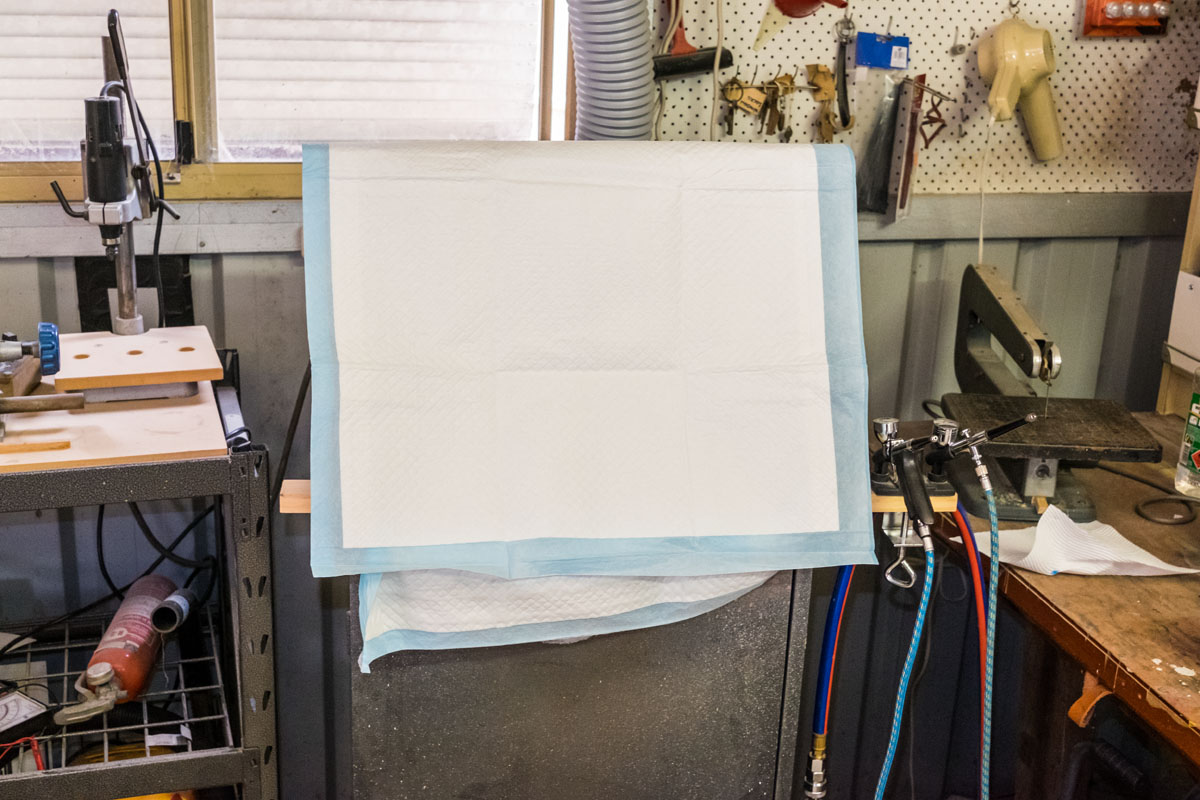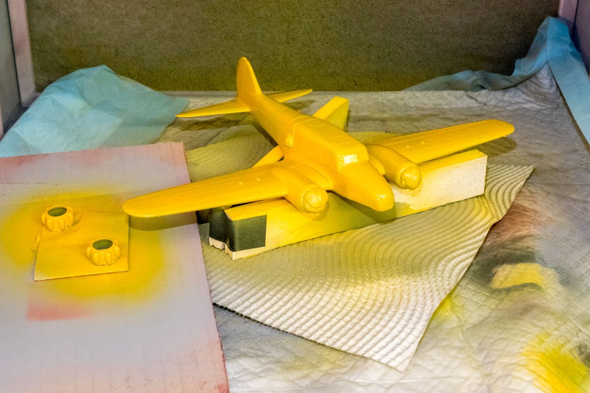 The bottom side got shot with a thin coating of the yellow after dinner one evening and was dry by next morning – but with some disconcerting dust or hairs in some sections of the coat. These may be an artifact of the spray gun, something left behind after rubbing down the undercoat, or drift-ins from the rest of the workshop. Fortunately they rubbed off with a paper towel, but I’ll have to be more careful in the future – the paper cover over the spray booth after the first coat on the topside of the ship should stop the drift of dust in the air.