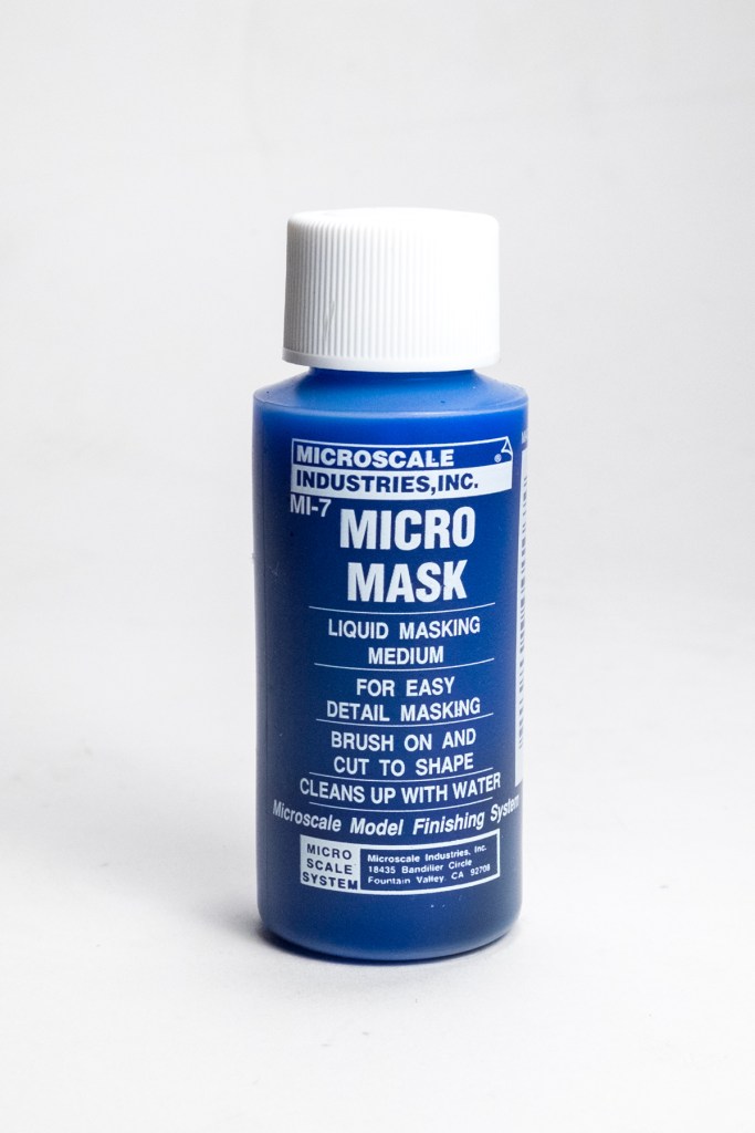 c. Micro Mask – the blue masking gel made for modelling. Applies easily, looks great, goes over any curve. But when you hit it with an alcohol-thinner acrylic paint it develops cracks in the coverage and leaks the paint through. Might be fine for oil-based enamels, but for acrylics…Bad idea.