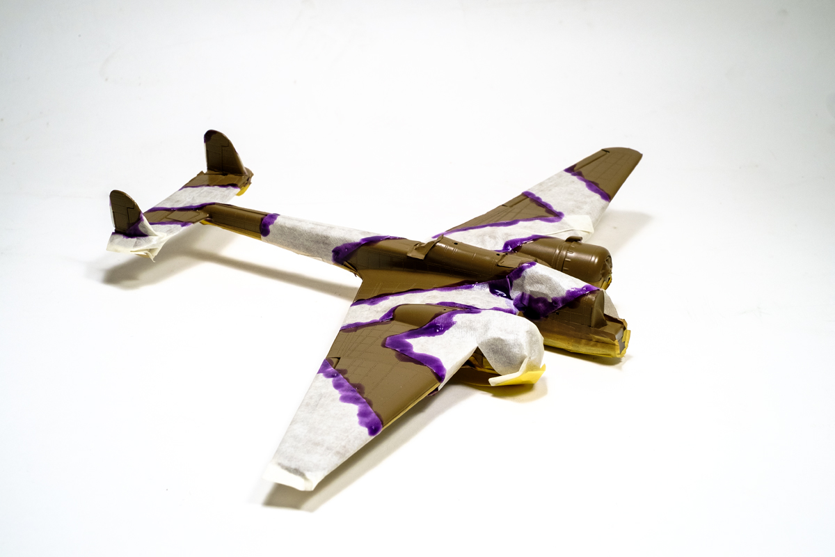 d. Humbrol Maskol – well, it’s not daunted by acrylics – I’ve used it before with success, but that’s a lot of surface to paint on a 1:72 light bomber. So I decided to try a combo – masking tape masks with simple shapes and the complex edges added with Maskol. It was fairly simple to do and went quickly.