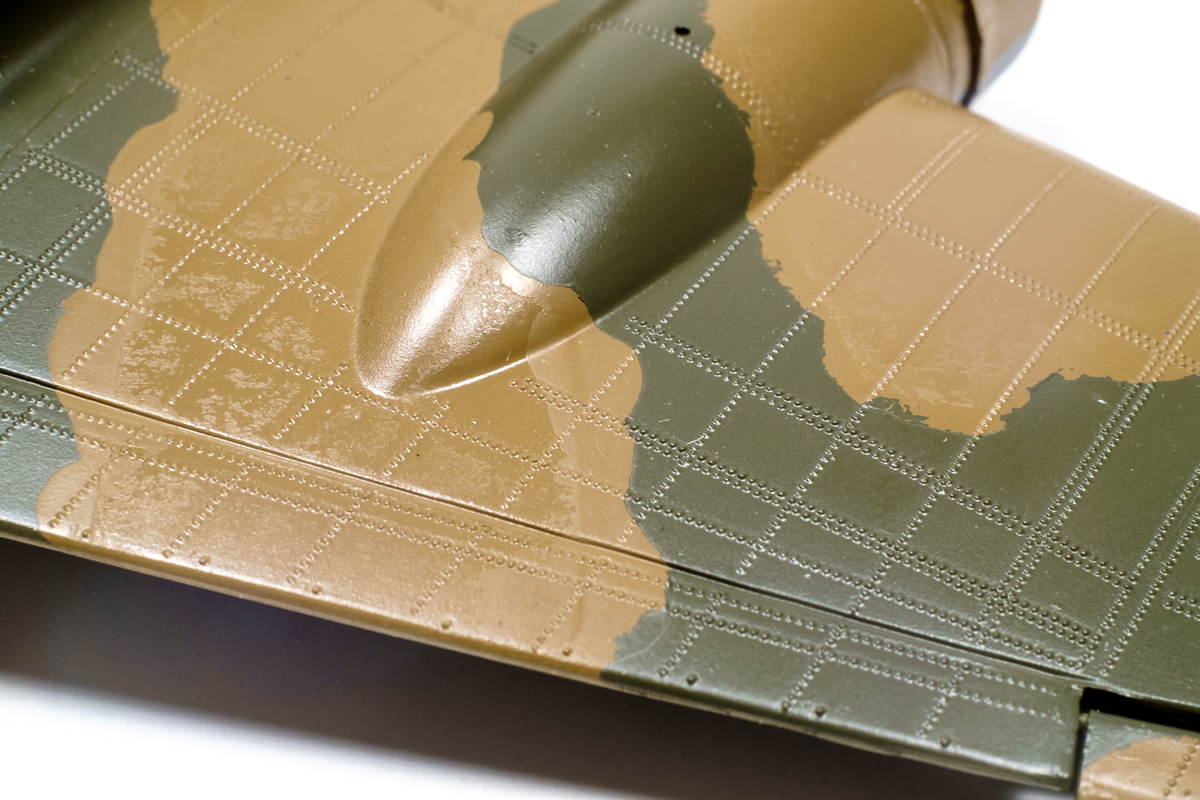 The basic brown undercoat was Creos Mr Hobby Dark Earth cut 2:1 with Tamiya Lacquer thinner and I was delighted with the way it sprayed and held a semi-gloss. The dark green was also Creos and went on equally well…but when I pulled the masking off I found that the tape had popped some of the shine off the surface. The Maskol was not the chief culprit.