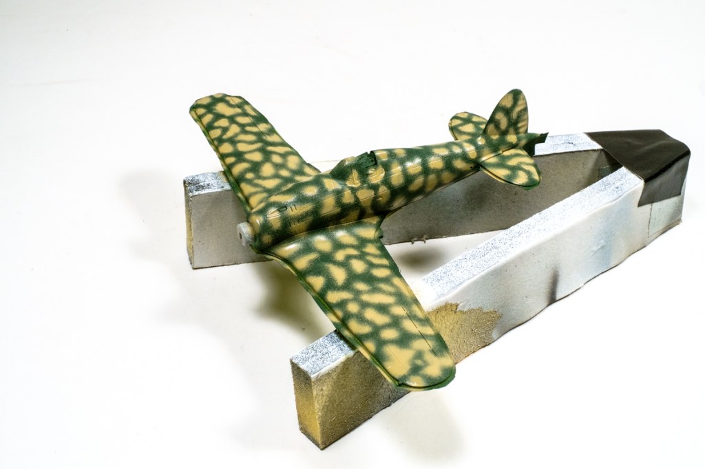 I am pleased with the result so far and will finish the rest as per usual. But the next part of the experiment will be the clincher – I’m going to hunt out another small Italian plane of the same era – a different type, perhaps – and try putting the sand yellow on first with a network of green lines over that to break it up. Then I’ll compare the two methods. I may even cut a bunch of small masks from a clear tape product to leave hard-edge spots.