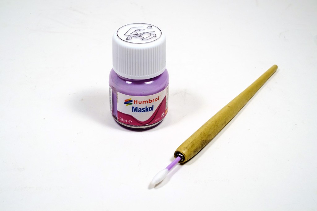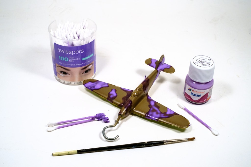 I tried them with generous dips of the Maskol and found that they are the best applicator for this rubber solution that you could want – especially if you are doing British A or B camouflage. They do the swoops and small scallops easily, and when one starts to ball up with dried rubber you just discard it and grab another. The whole plane took just two of the sticks.