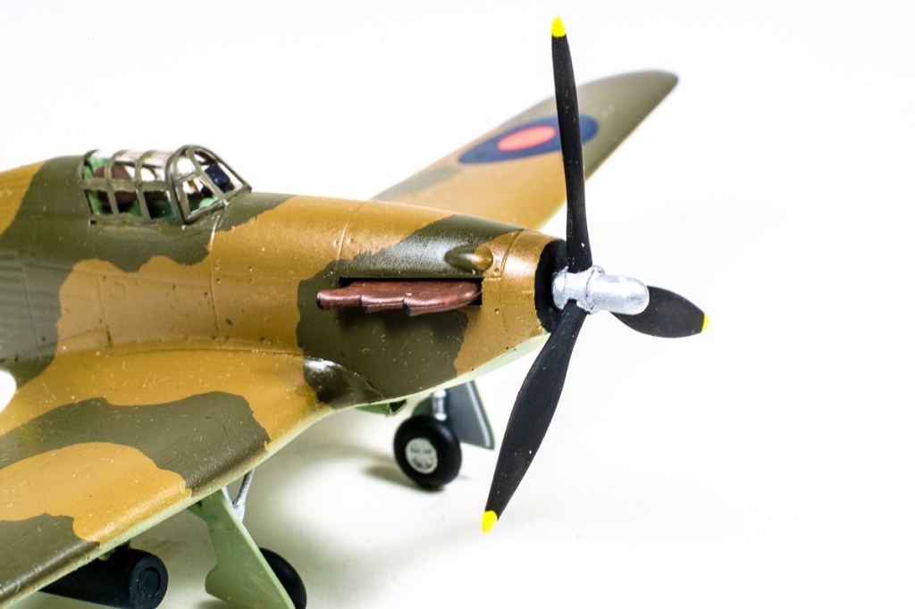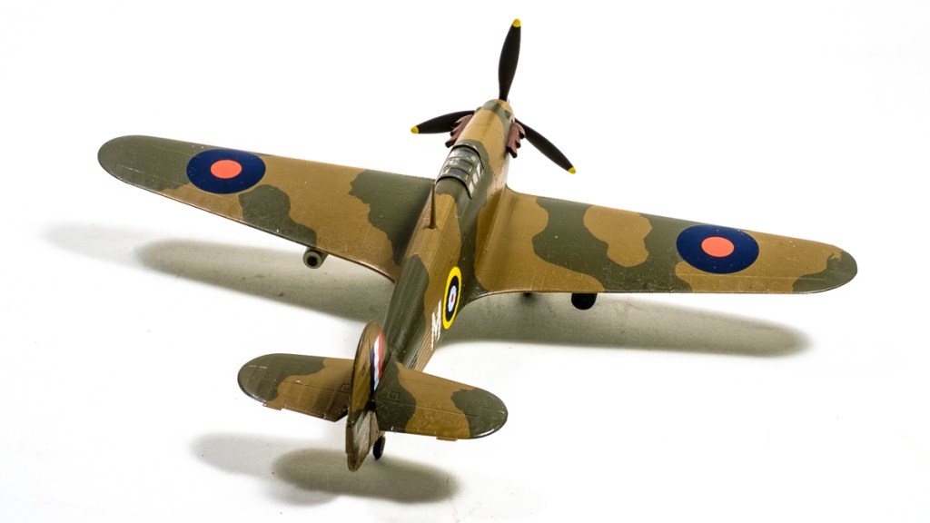 After the undercoat was set I put on the brown, and then the green. The Humbrol Maskol worked brilliantly – just as it was meant to. The Gloss Cote and decals went on very nicely, albeit I knocked over the Micro Set and lost half a bottle. What really went wrong was when I thought to ensure a clean surface for the final Satin Cote, and brushed the whole aircraft over with a soft paintbrush. Unbeknownst to me I was charging it up with static to attract dust…and the end result is a very lumpy and murky surface.