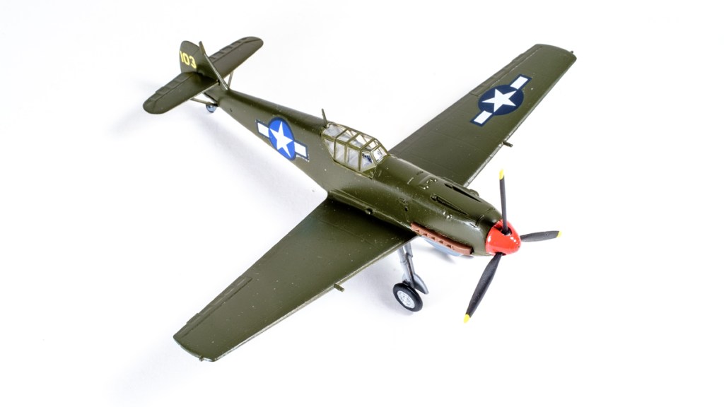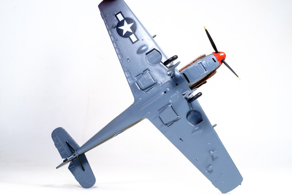 This Messerschmitt is one of the latter category – it depicts what happened to Me 109’s that fell into American hands in the last days of the North Africa campaigns. Shipped back to the US on a returning freighter, repainted into USAAF colours of Olive Drab and Neutral Grey, given a fin number, and sent out to the Army fields to give the trainee pilots an idea of what they were going to encounter. Flown to exhaustion and eventually to the scrap yard, yielding as much assumed information as they could.