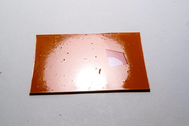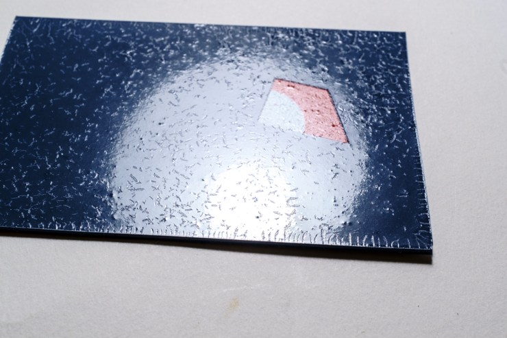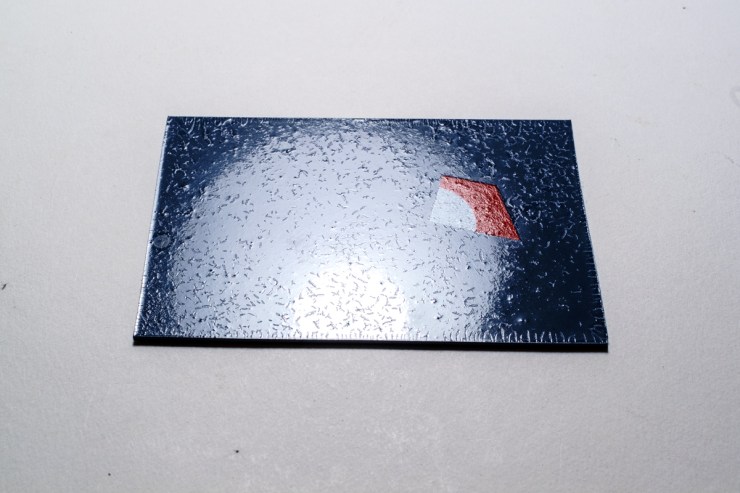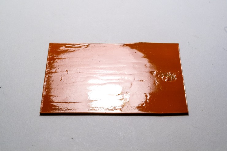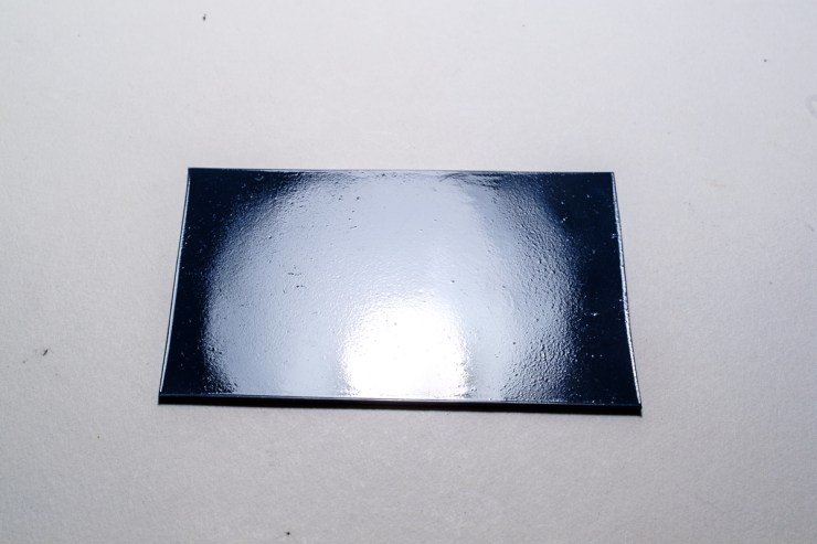 The chips were set aside in the drying cabinet set at half power, and set up well in an hour. But a curious defect was noted with the matte Mr. Hobby and gloss Tamiya – the floor polish contracted slightly and dried with tiny cracks at the edges of the panels. It was quite noticeable. The orange Mr Colour panel had none of this cracking.