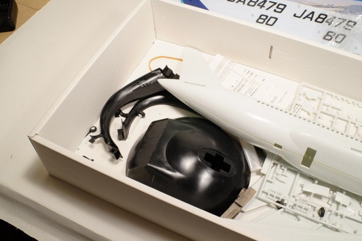 In the initial rush to it, most things were done pretty well for an inexperienced modeller. There are no glue fingerprints evident. Unfortunately the tube glue of the time has not stood up to the test – the fuselage has split completely – the only thing that keeps the two halves together is the tip of the vertical stabilizer, and I reckon a thin kitchen knife run up there would yield two clean parts again. This is no bad thing, if my daughter wants to take her build to the next level and plan to paint the fuselage later. We could make sure of the interior glazing, mask the many windows, and make a proper job of the centre seam.But this is not my build – it is hers – and she’ll have to decide the level of sophistication she will go to.