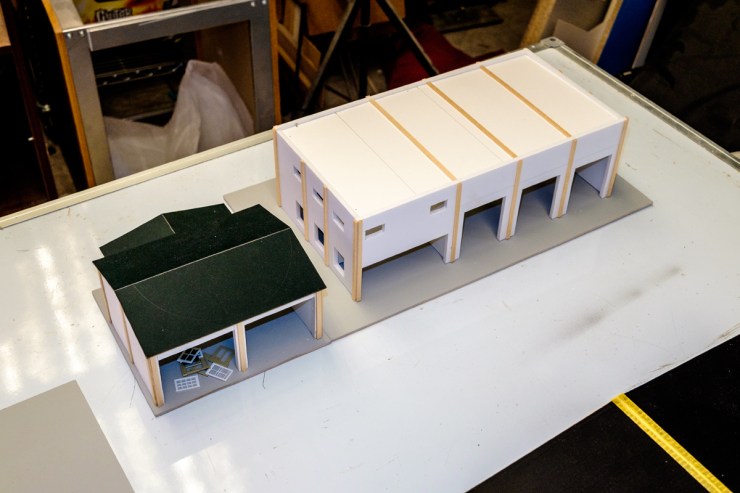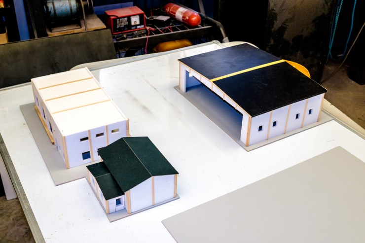 Then – 9 hours later, there was a hangar and a firehouse out in the Little Workshop. They’re made of foamcore, matt board, wood strip, and corrugated plastic sheet – with holes for a few commercial windows cut in. The forms are still blank, but the structures are done. By the start of the week I should have the doors done as well. Then it will be painting, decoration and signage.