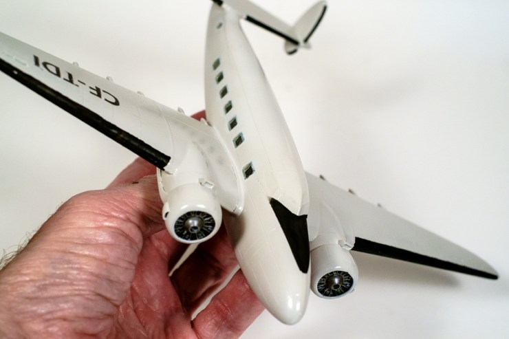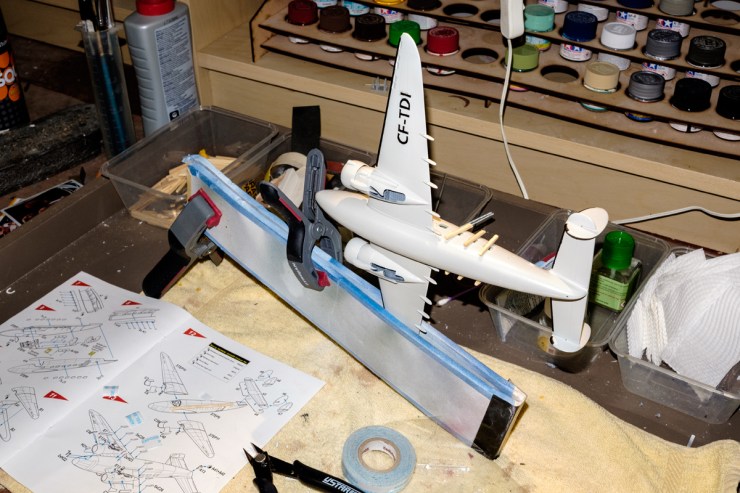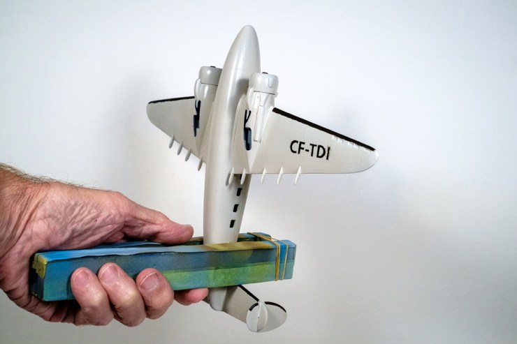 Made up of a Stein’s Plane Support and a rubber band, it gently wraps the fuselage of a model to allow you a complete grip of work as you paint the details. No fingers go near the model. It can be supplemented with foam or paper towels at the part that touches the paintwork. The other advantage is when you are spray painting, your hands are out of the paint blast.