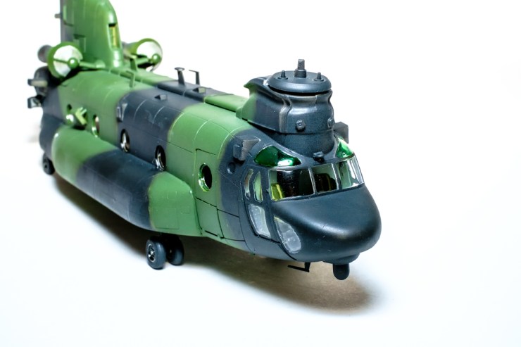 The paint layers for the Chinook were Mr. Surfacer 1000, then Mr Color in green and bronze-black, and finally a matt coat of Mr. Top Coat to flatten everything. I was delighted to see that the painting went perfectly, but still had a nagging doubt about the new masking material – had it leaked anywhere? Those solvents for lacquer paints are strong. Would it cling too much to the paint and chip off badly? Would it fog the clear styrene?