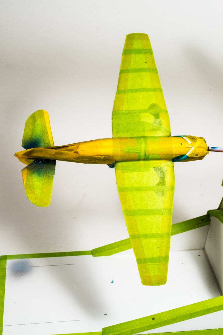 a. I smoothed the masking tape blocking the lower part of the wing as closely as I could with a specific instrument as well as my fingernail.