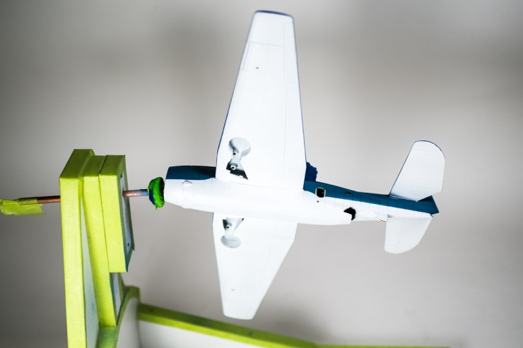 The result, including a second masking after the intermediate blue had cured, was excellent. Even in places where the characteristic Grumman fuselage seams were deepest, there was no tracking of the intermediate blue into the white. And no bleeding of the dark blue either.