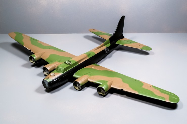 I make my models as museum restorations and every example has some flaws introduced by the restorers. Either an imaginative paint scheme or one that has one shade wrong. Or, as this one, evidence of repainting around some portion of the structure. I can continue happily with the Fortress Mk III as a display plane with all the doors open. The fact that the underside is still pretty makes up for the fuselage sides near the roundel.