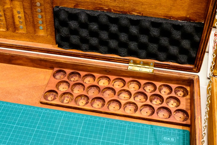 And here is another good thing. Every configuration on this case can be changed – compartments added or subtracted – magnets or strips put where needed. Garrett is ready to work with you to make your perfect custom work station. Finishes are optional, and he has access to far more than just varnish or beeswax.