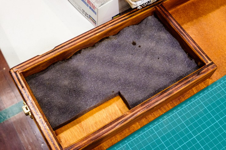 His basic aim was to make a modelling desk/box that would allow people to work on kits with most of their tools and paints around them in an organised fashion and then to close it all up and move it between venues when required. Or close things away from disturbance in a busy household.