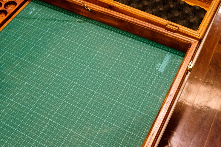 There is either an A2 or A3 cutting mat in the bottom, with a lip around the base to prevent stray parts from disappearing off into the carpet.