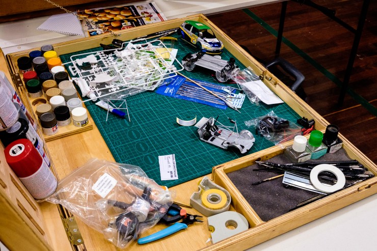 For several years I have tried to get to the model Car Sunday, but failed – yesterday I succeeded and found a very interesting product made by a local craftsman. The product is a range of portable modelling boxes and the maker Garrett McIntyre from Collie in Western Australia.