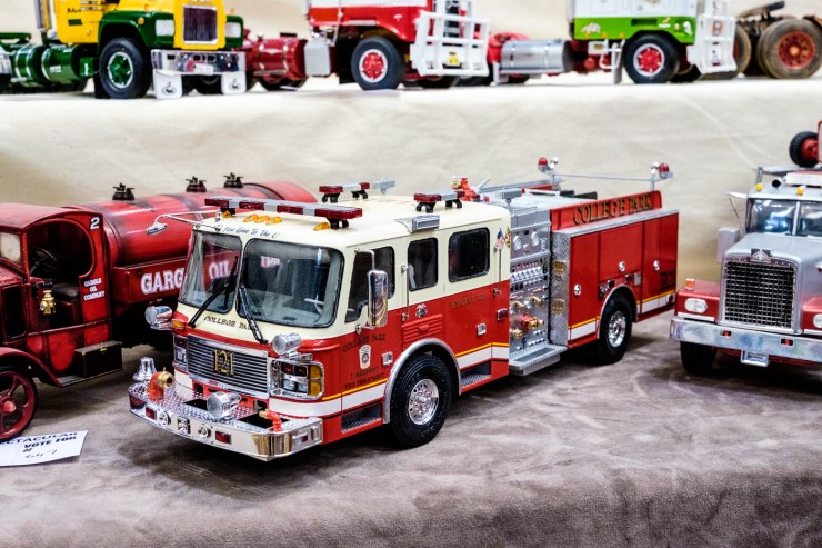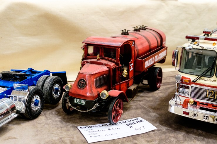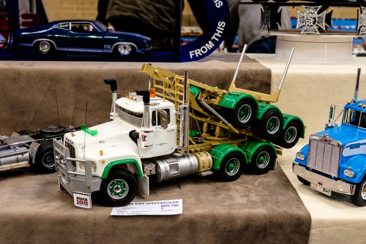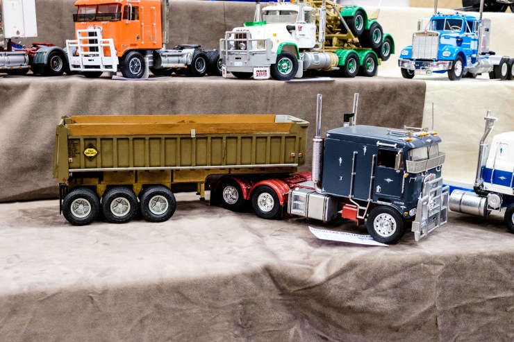 The scale of the trucks at the Model Car Spectacular is probably 1:25 or 1:24. Or maybe 1:35, though that is an armour scale. Whatever, they are small enough to be buildable in an average hobby room and big enough to see all the details.