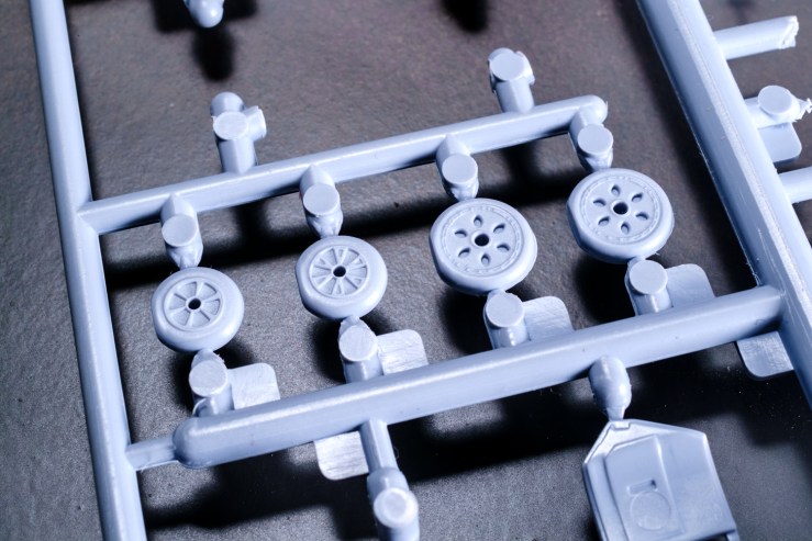 Still, cannot complain about the wheels as such – detailed, with squashed tyres and all. And now that I am masking the hubs before painting th tyres, all that much better a job.