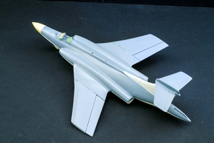 As this model is made to represent a museum relic from the cold war era it doesn’t have engines – the museum will plug up the intake and exhaust tubes with flat covers. The finish is unreasonably shiny – courtesy the zeal of the paint shop and spare cans of grey – and all the external hatches are sealed against the incursion of weather or tourists. The wings are locked in the down position…mainly because they don’t trust the folding mechanism after all these years.