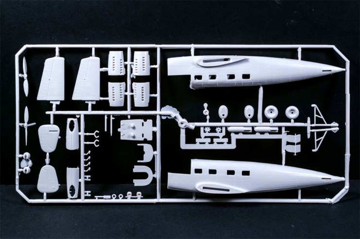 But enough of the history. Here is the new RRA airliner, newly bought from Smėr – my first model from this firm. It’s an end-opening box but sturdy for all that, and the model survived an air trip from Melbourne in good condition. It’s only two grey sprue trees and one clear…and I note that the clear one incorporates the entire nose of the aircraft. The moulding seems clean enough, and while the panel lines and rivets are raised, they are quite delicately done.
