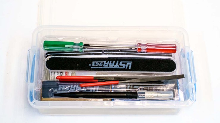 The next layer contains a hobby knife, two screwdrivers, three decent small files, and a sanding stick. Call this $ 15, $ 18, $ 10, and $ 14.