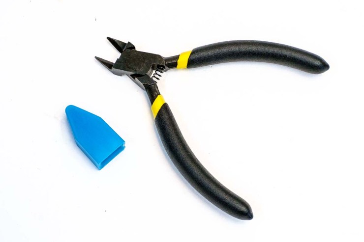Then the first layer of the contents; nippers with protective cover, straight tweezers, curved tweezers, and a plastic gluing aid. Disregard the last named as a gimmick, but the others amount to $ 39, $ 5, and $ 15 respectively. Here’s the prime product I went in for – the nippers.