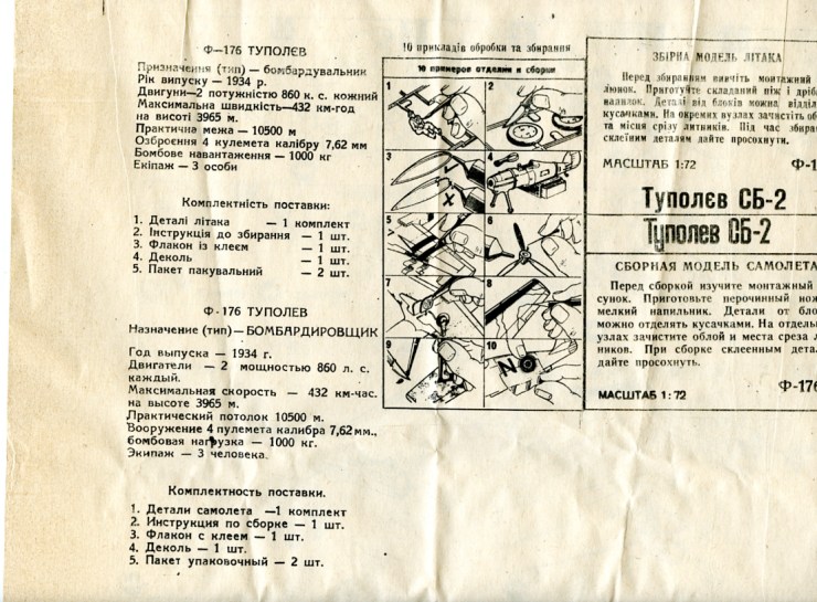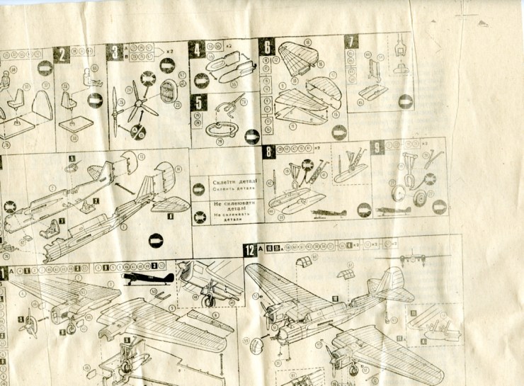 This kit may not have started out in the USSR, though the bomber was certainly a Soviet design of the 1930’s. I suspect it may have been derived from a Frog mould of the 1950’s…long worn out and sold to the Russians when Frog was closed. If this is the case, the Russians did little to refresh it – it is crude.