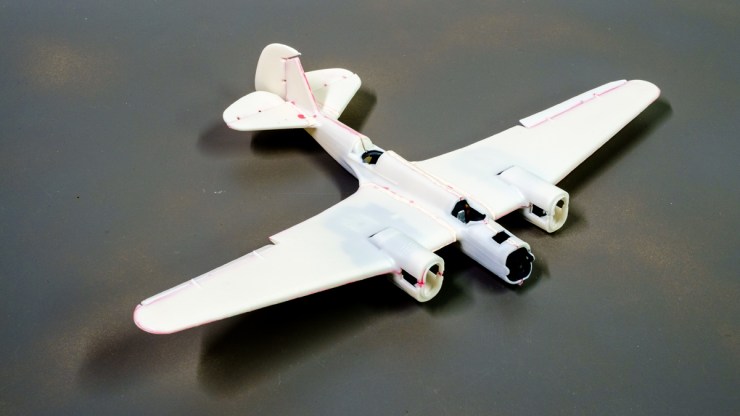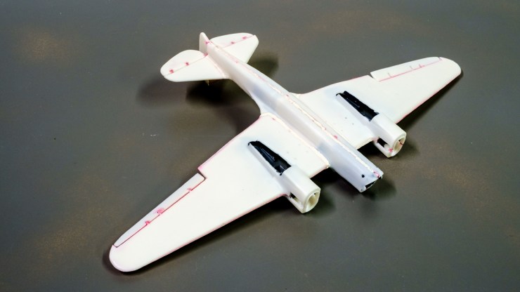 I will not say that every surface of the aircraft was flawed – some mating areas needed only a lick with a knife and sandpaper to become everything that was needed. Others promised to become a sinkhole of putty. In the end, I was surprised how well the basic structure came together. The white plastic shows the red MEK cement in the gaps and it’s not too bad.