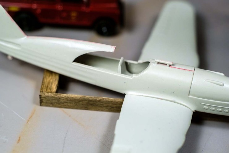A deeper concern is the lack of any detail in the cockpit – particularly aft of the pilot’s set. The box art of the kit shows a structure reminiscent of the sort of cutout on the Curtiss P-40. The canopy casting is dreadfully fogged, but I’m still not willing to be reduced to painting it black or casting a tarpaulin over it. It’ll get a furniture polish treatment to see if that clears it up and then I’ll think about a scratch-built panel inside there.