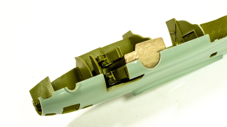 The interior is supposedly chromate green according to SMS paints from Melbourne. Sprayed on wonderfully well straight from the bottle but I still am suspicious about the actual colour. However, I have a bottle to use up and it’s either spray the US aircraft or spray the cat. The hole for the upper turret was being patched with a piece of sheet Plastruct bent and cemented – as was the ball turret hole.