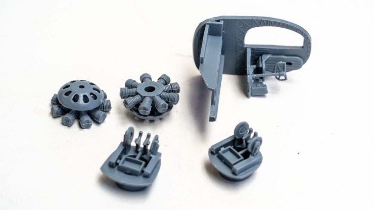 I’m a little less sanguine about the decision to mould a separate engine core and cylinders, though I’m happy to say they did go together fairly well – but they will not go into the nacelles without sanding down the cylinder heads. And then it will all be hidden behind that questionable front plate…