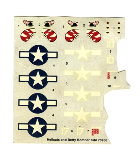 They appear to be part of a three-plane set from Lindberg – two F6F fighters and a Japanese Mitsubishi ” Betty ” bomber. The set came out in 1998 but the basic planes seem to have the look of 70’s models. Raised rivets and simple construction.