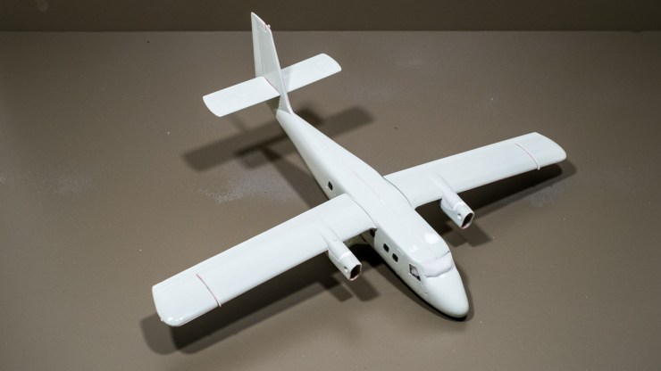 The Twin Otter fuselage is closed, puttied, and smoothed. The wings are ready for their undercoat. All the ancillary parts are stuck to bits of matchstick or alligator clips awaiting the airbrush.