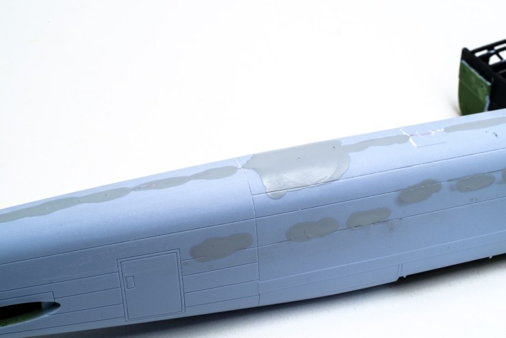And no real dramas with the Upper and lower M/G positions. Airfix provided the plug for the bottom and I made a plastic shelf inside loaded with Tamiya putty for the top one. The heavy scoring is to provide grip for a coat of Perfect Plastic Putty and eventually some surfacer