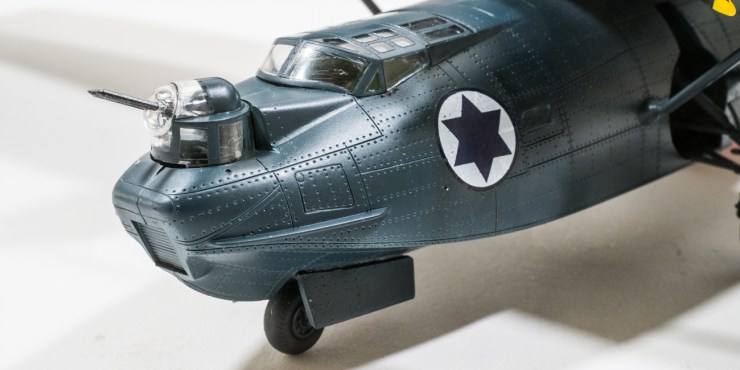 I’m very grateful to the photographers who have circulated around Hatzerim in the Negev to capture this and other old IAF planes. This one appears in Google pictures in various stages of repair – including a final finish in blue gloss Navy paint. I’ve decided not to go to this complete gloss as the colour coat has brought up the rivets so well. The decals have a coat of Mr Color UV clear to help stay on and the 3402 marking is stencilled on anyway. I was frustrated in my search for any white lettering that would be suitable – and I looked through the entire SMCWA spare-decal box as well. If I get to a major model exhibition in the next year or so I am going to bite the bullet and spend money on 1:72 sheets of 24″ and larger letters and numbers – black, white, and grey. They always seem to be needed and unless you stick to kit sheets, you never have what you need.