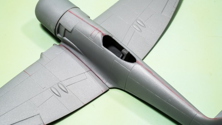 The cockpit is a floor, a bulkhead, and a seat. Nothing else. Not even a dashboard. But when you try the thing in place dry, there is nothing to be seen from outside anyway…so I just airbrushed a grey coat and proceeded to close the fuselage. It went together seamlessly.