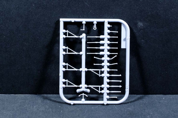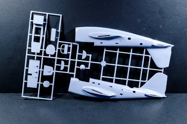 It has a little PE, a little resin, but mostly injected parts. The engines are one-piece injected, thank goodness.. The landing gear is sturdy enough to support the thing. Needs to be – there is a massive amount of plastic in that fuselage. There is also a complex interior in the front of the machine and some fiddly antennae on the top – we’ll deal with that when we get there.