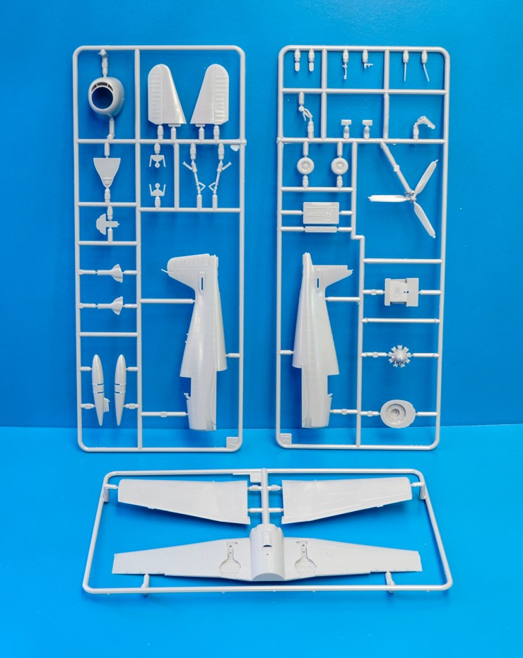 The basic parts are not terribly different from any other Hellcat kit. Raised lines, but discrete ones. Fine detail on surfaces – and the surfaces are polished. Delicate cowling. Just moderate detail on the engine, but a positive locating firewall to put the propeller shaft dead where it is expected. Good prop. Tread detail on tyres.