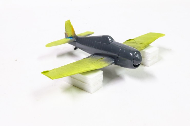 And here is the state of play at the end of Wednesday – undercoated in two shades and a colour coat of Engine Grey Mr. Color over the fuselage. It’s set as hard as granite but I’ll give it even more time overnight before I peel the wing masks and reverse the coverage.