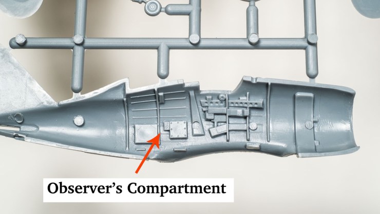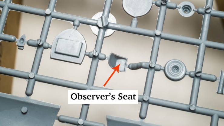 This was too big a hole to be a short-shot. And Lo! on the instructions it has turned up with a clear styrene cover. I suspect it is a hatch and that someone is supposed to crawl into it and sit on the tiny seat inside.