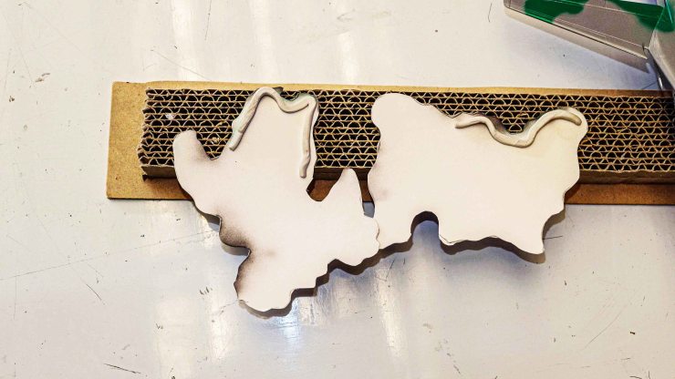 For the first trial I took two of the masks and attached some rudimentary lengths of white-tack worm to the underside. This let the mask sit proud of the surface – rather like the putty worms do.
