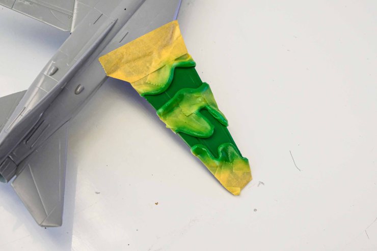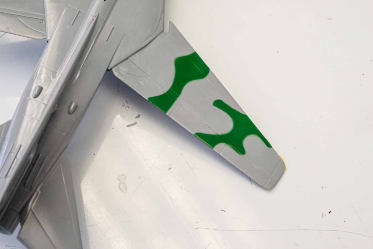 Ivan’s wing and a rough camo pattern. This time the stop watch showed that the wing went on in 5 minutes. Time that forward to a complete masking job ( remembering that I do not mask canopies ) and you get to about 15-20 minutes to do an average plane – less if it’s smaller. And you do it with 1/5 of a pack of J. Burrows White-tac…or about 40¢ worth of putty and another 50¢ worth of tape.