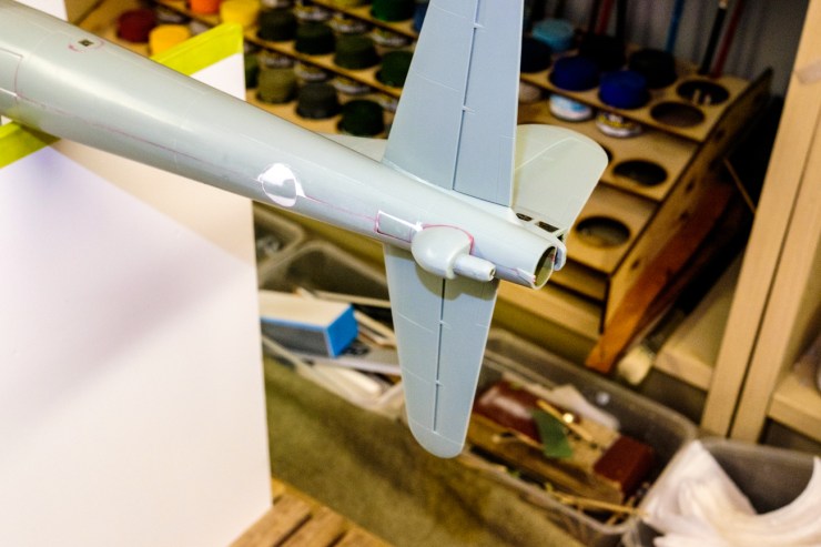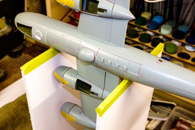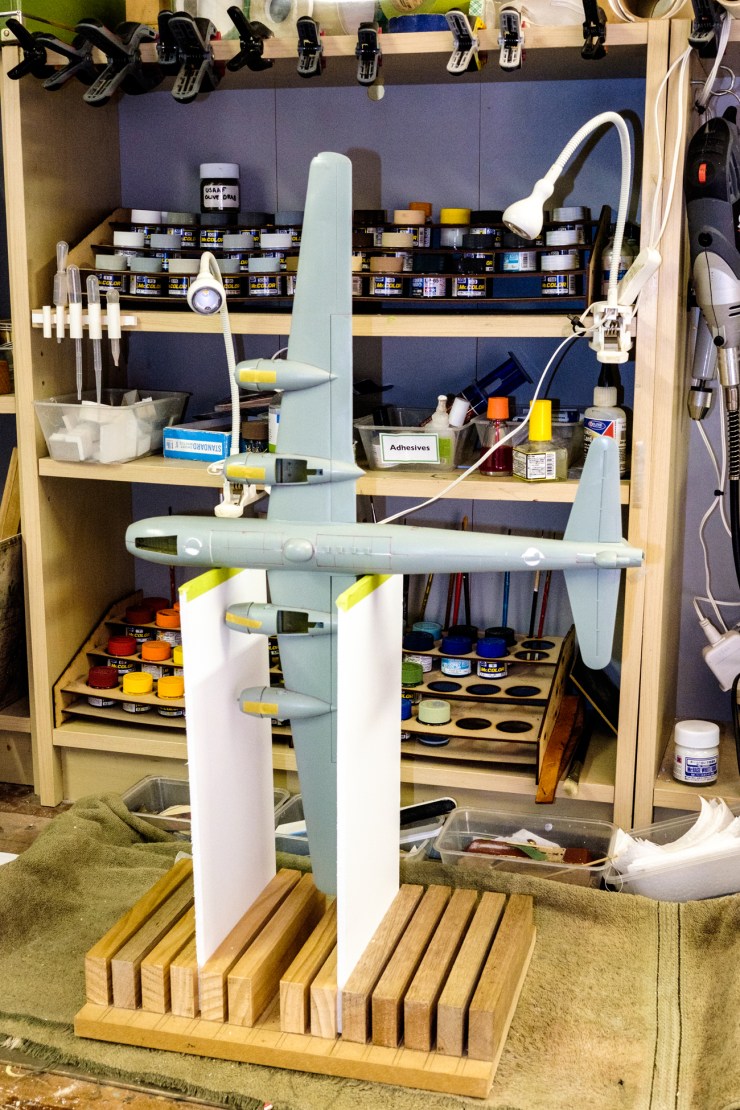 But what do you do with the wings on a B-29? This is by far the biggest build so far – and while the fuselage and tail planes are within the envelope for the jig, there is no way that it can balance on one wing to have the other one cemented with safety. Not until I broke out the 5mm foam-core board and cut two enormous supports.