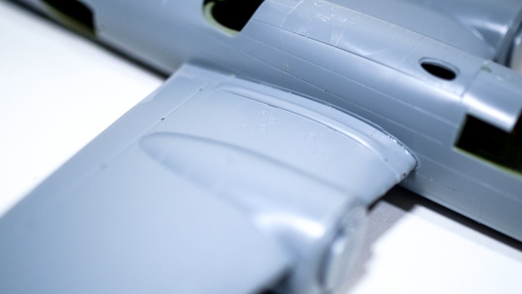 Being a Hasegawa kit, the Peggy’s fuselage slipped together with no stress on the seams – thus they could be done with Tamiya Extra Thin and become quite invisible. The scrape line around the centre is extremely small.