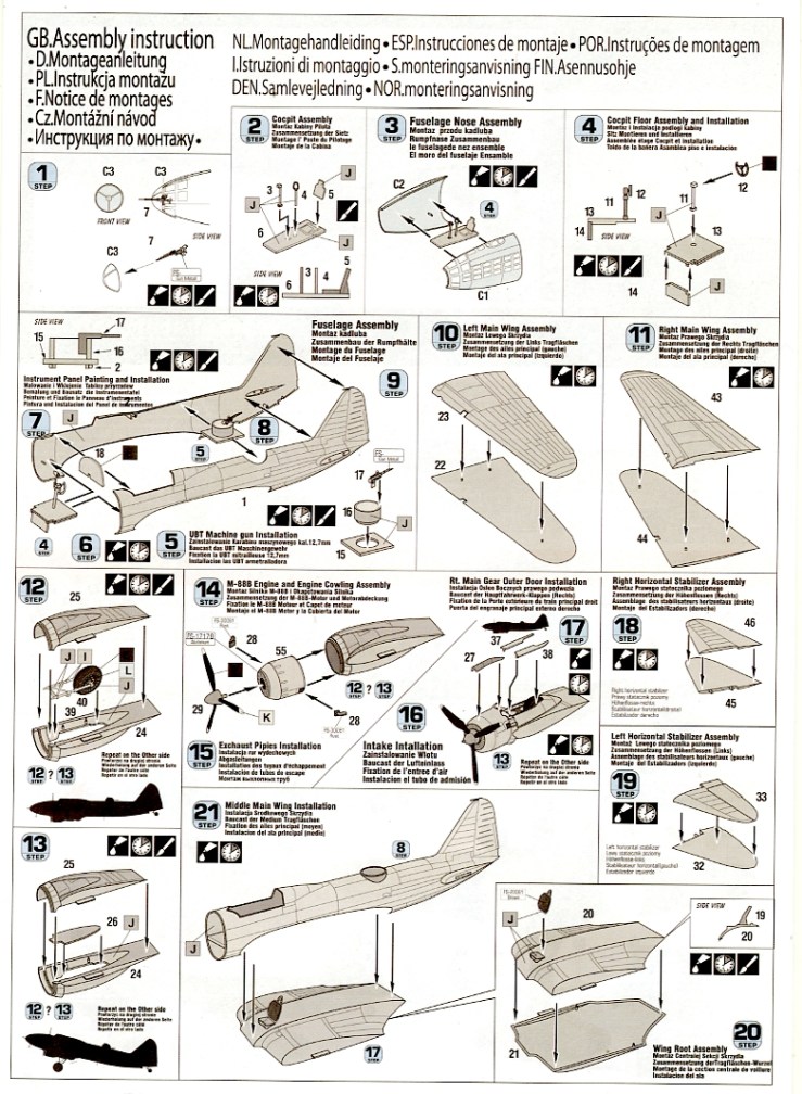 Like the Petlyakov 2 that was recently completed, this kit still has the Zvezda plates attached to the sprue trees. It may have Russian decals as well – I can’t tell. The instructions are new-made by the Polish firm that’s selling the kit, and they are actually amongst the best for eastern Europe – far better than their Czech competitors. The kits may be a borrow, but the bargain is there.