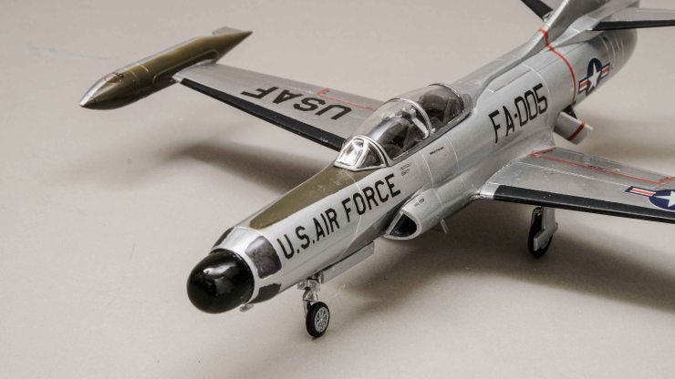 The clear silver finish you saw last time has been preserved. I was a little doubtful about the decals of this 1993 kit – the stars and bars look decidedly distorted compared to modern Cartograf examples. But I determined to play the hand dealt me and went ahead with the Option B – A plane from the USAF proving command in 1953. No glossing before the decals – the silver seemed smooth enough.