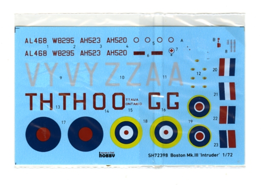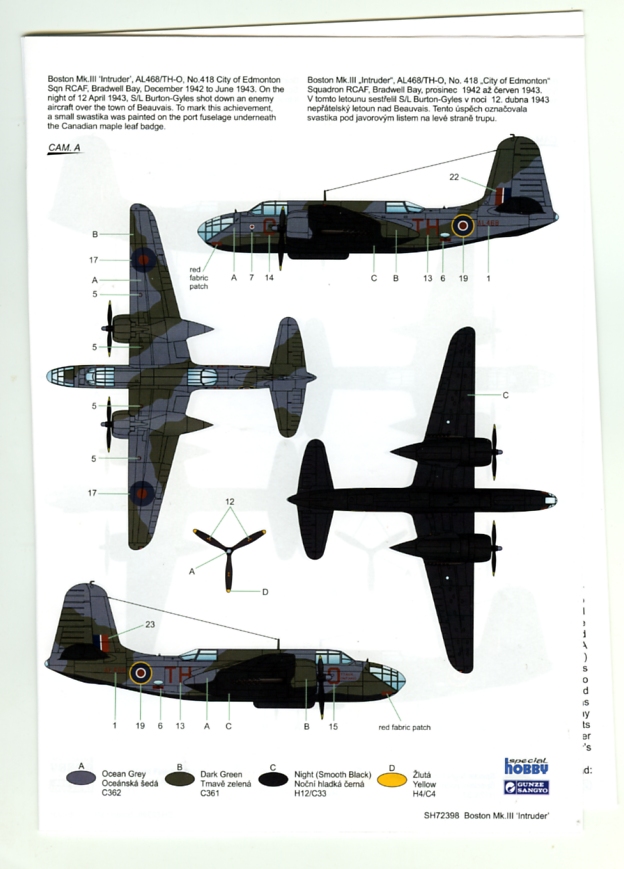 I build RCAF planes, as you know, and I have a wonderful illustrated book of WWII types that I am trying to adhere to. In it is a Douglas Boston MkIII – TH-O – that scored a famous victory as a night intruder for an RCAF Squadron Leader. Lo and behold, Special Hobby decided to kit this exact aircraft in the livery of the time with the distinctive markings. All I need do is follow the instructions assiduously and I’ll have a star attraction.