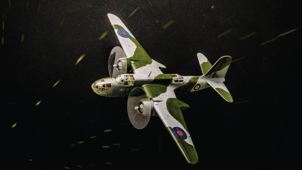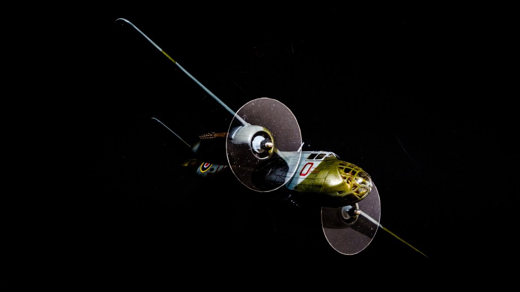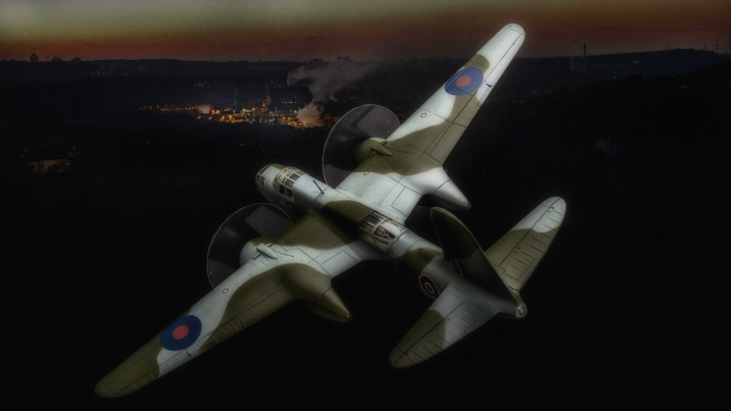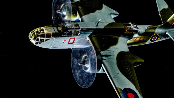 The daylight picture and some of the night ones are quite interesting in that the squadron code – TH-O appears to be be black. In reality, as a searchlight photo shows, they were painted dark red. A trick of the light.